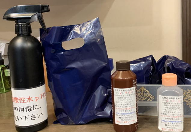 | トイレにはいたるところに、強酸性水を配置。便座は強酸性水で殺菌し、トイレットペーパでふき上げてください。無菌になります。 |